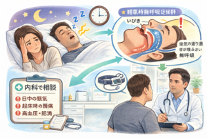 - 強いいびきに加えて、「呼吸が止まる」「息を詰めるような音になる」といった場合、睡眠時無呼吸症候群が背景にあることあり。
